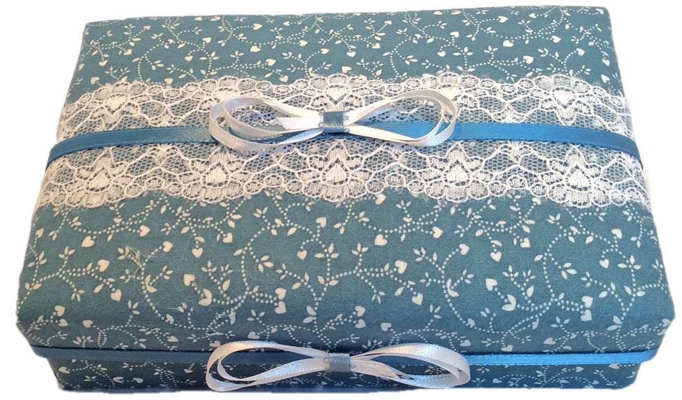 This lovely gift box will appeal to those who love lace and country-style décor. Elaborately decorated with lace, dusty blue ribbon and bows against a small calico design in dusty blue and white. Inside, a calico heart rests on white satin. Originally priced at $21....discounted to just $16 !