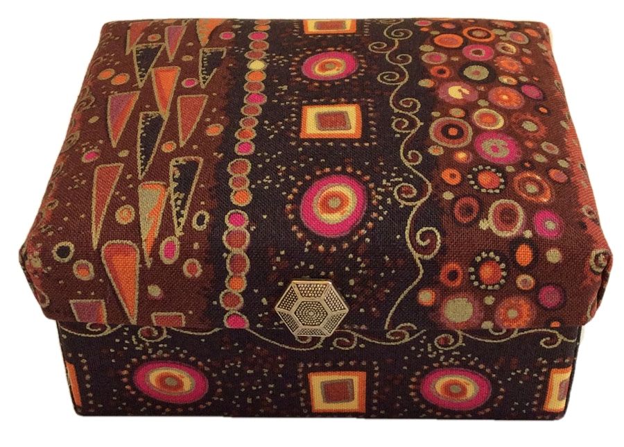 This is such a great fabric - geometric designs in burnt orange, browns, rusts, yellows and golden accents splash across this wild box. Brass hexagonal button accents lip of lid. Inside you'll find a band of geometric designs against dark wine satin. Only one box left. Originally $16....now only $11!
