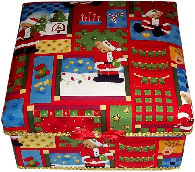 Christmas fun enlivens this wonderful holiday gift box. A Santa Bear strings lights, carries the decorated tree and holds out a golden heart for you. Three adorable Santa Bear decals appear on red background inside gift box; golden trim with red and gold bow adorn lip of lid. Some of our customers reserve this Christmas box to present their most special holiday gift year after year. Others use it to hold holiday cards they treasure, Christmas photos, delicate Christmas tree ornaments and other holiday memorabilia. Last box left in this fabric. Comes in one size only - 9" x 9" x 4.5".