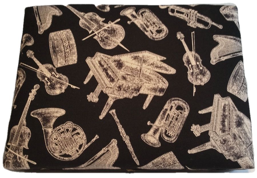 Instruments of a Symphony Orchestra, including a harp, cello, French Horn, grand piano, trumpet and bassoon, appear in etched taupe against black background. Orchestra instruments appear inside box as well. Last Boxes left in this fabric. Buy as a set or an individual box. Prices reflect $5 discount.