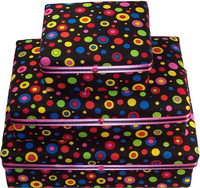 Not certain what to give someone for their birthday or special occasion? Think 'Outside the Box'...or rather, present your gift in this festive box! Bright dots in red, blue, green, pink and yellow cover a black background on the outside of this gift box. Inside bottom has bright pink satin with strips of the party dots at an angle. Lip of lid is encircled with deep pink and black ribbon, touched off with a pink rhinestone. What a great way to present a birthday gift! Terrific as an individual gift box or as a set. Prices reflect $5 discount per box!