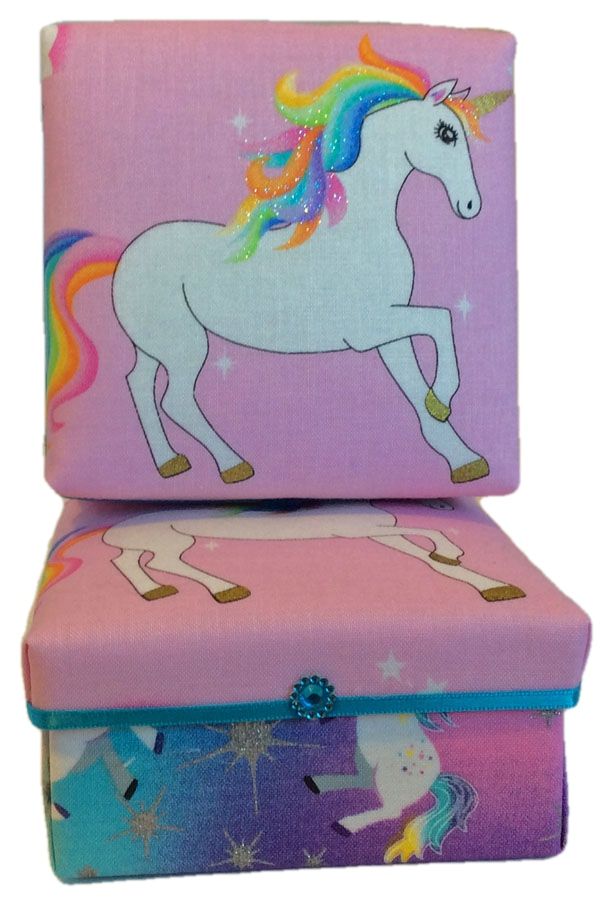 The Tiny Magical Unicorns gift box sparkles with fairy dust on its flowing colorful mane and tail as it prances across a pink starlit sky. Lip of lid is encircled with thin turquoise ribbon and adorned with elaborate turquoise crystal. Inside, you'll find more unicorns on the move. A sure fire hit for any Princess or Knight in Shining Armor! This is our 'pint size' box - 3.5" x 3.5" x 1.5". See Magical Unicorn for the larger 5" x 4" x 2" size.